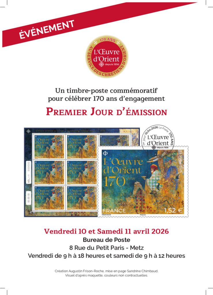 Si vous êtes philatélistes, n’oubliez pas de passer le 10 avril et le 11 au matin au bureau de poste 8 rue du Petit Paris à Metz à l’occasion de l’événement 1er jour du timbre commémoratif des 170 ans de l’Œuvre d’Orient.