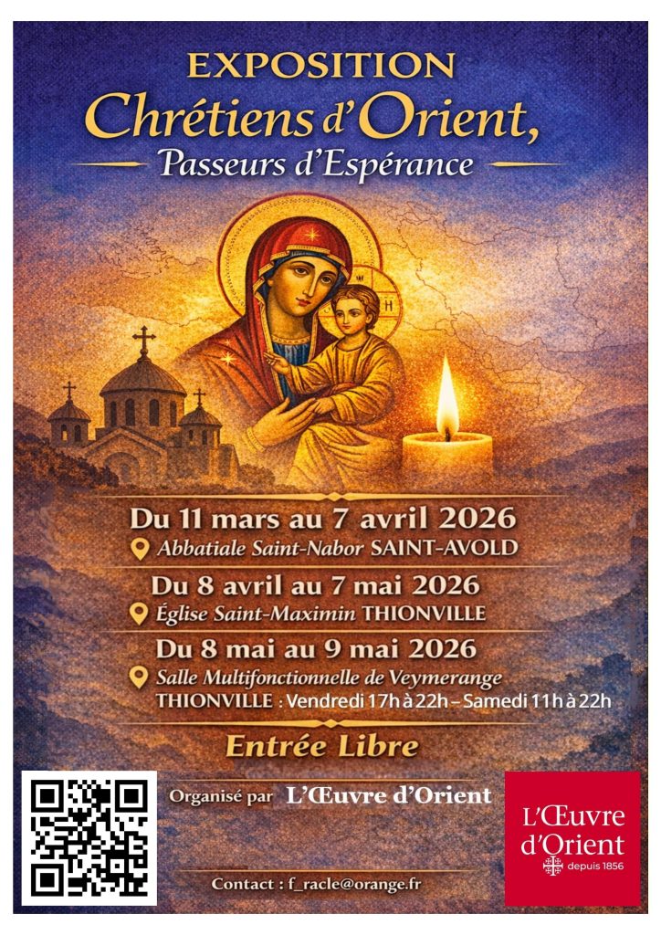 Vous pourrez profiter de votre passage à Saint-Avold pour visiter la très belle Abbatiale Saint Nabord où est installée l’exposition de l’Œuvre d’Orient « Chrétiens d’Orient, passeurs d’espérance ».