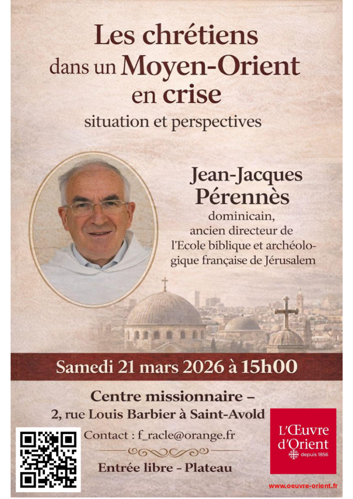 Je vous rappelle la conférence « les chrétiens dans un Moyen-Orient en crise » du Frère dominicain Jean-Jacques Pérennès, ancien directeur de l’École Biblique et Archéologique Française de Jérusalem, samedi prochain, le 21 mars à 15h au Centre Missionnaire de Saint-Avold.
